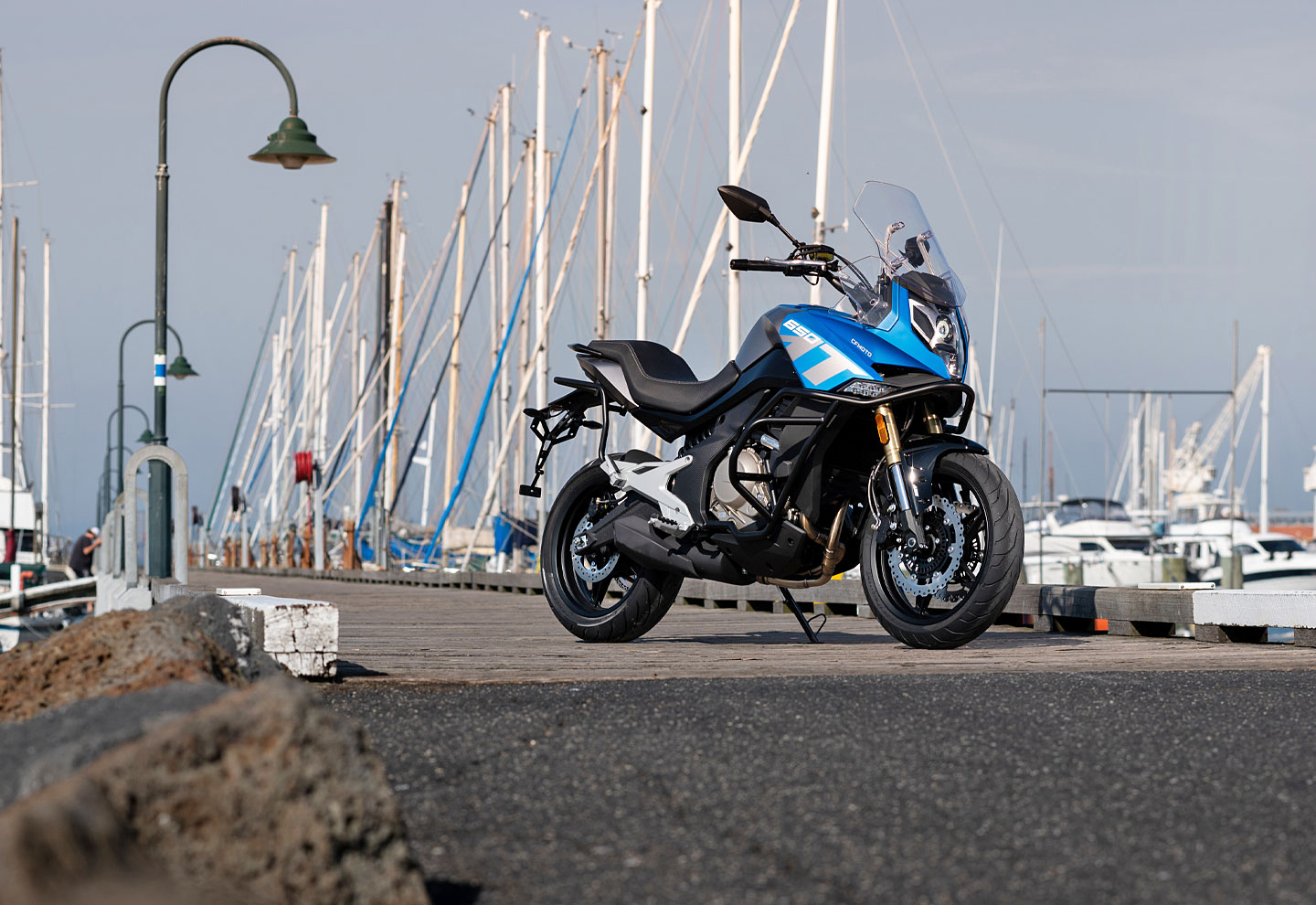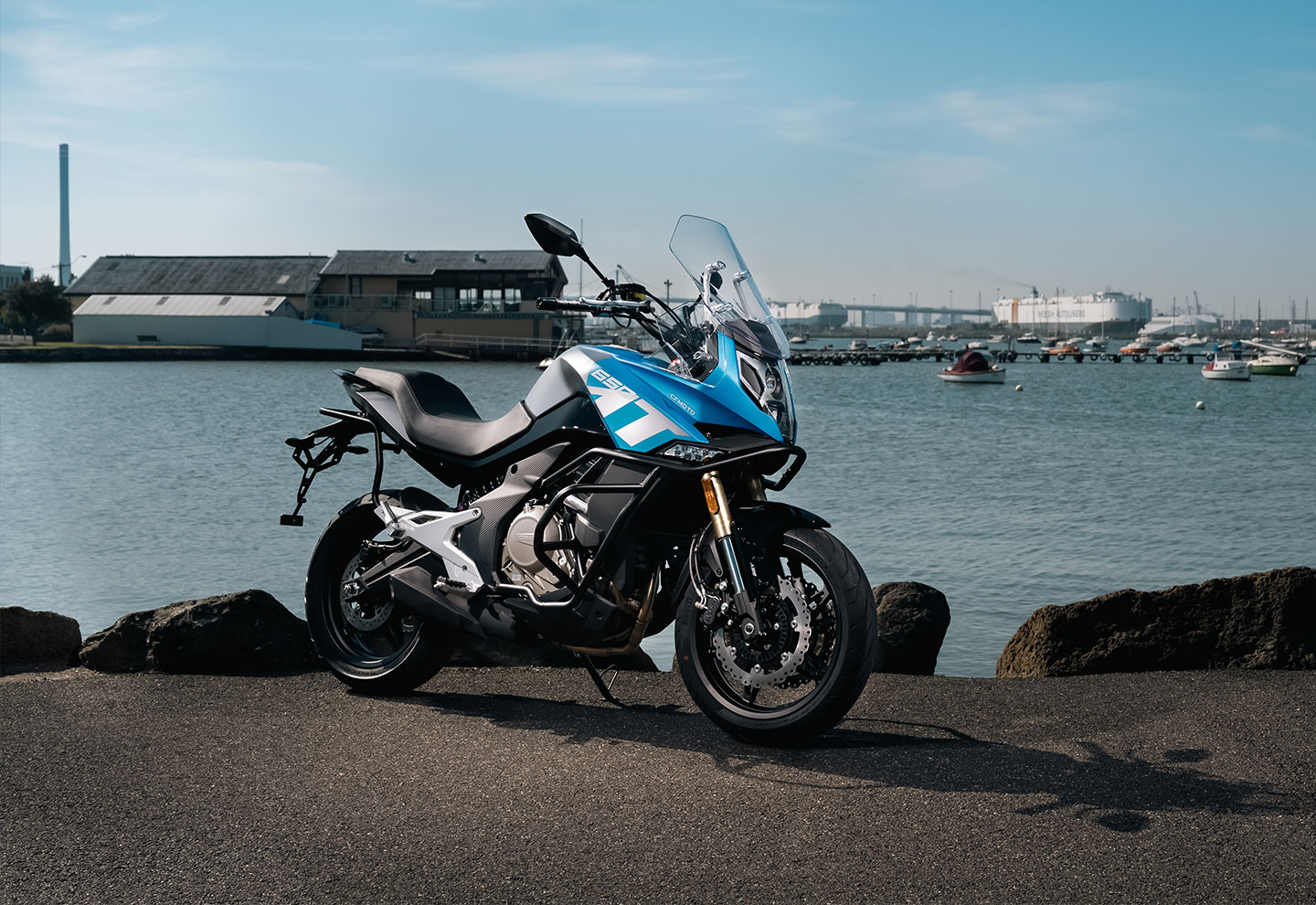 Angular lines from German design studio KISKA take centre stage on the 650MT ABS, including the LED head and tail lights, windscreen and fairings. Crash protection bars and optional panniers are incorporated into the overall design.