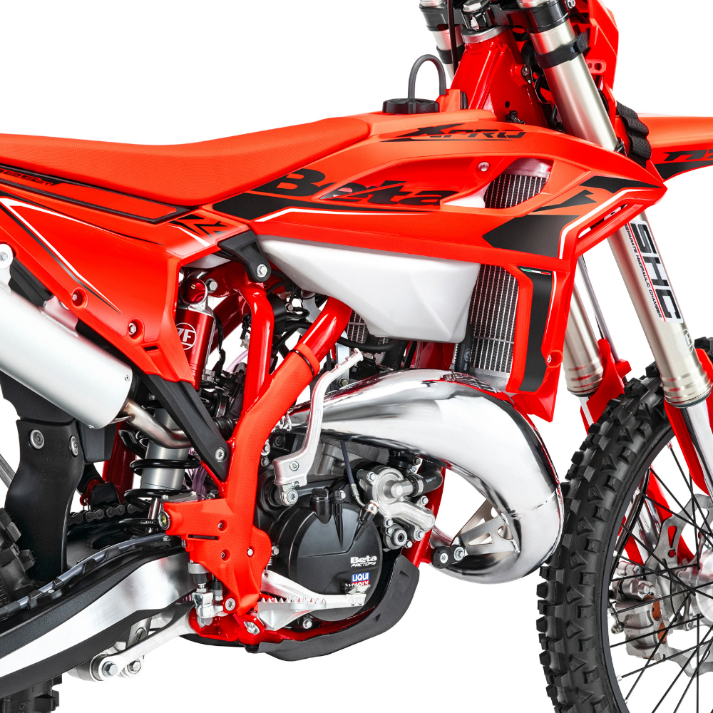 Engine Upgrades Beta continues to push the limits of its smaller displacement models. For MY26, the RR X-PRO 125 2-Stroke features a new piston and redesigned cylinder head with an updated combustion chamber. These modifications significantly increase both torque and peak power, giving the 125cc single-cylinder engine a more responsive and aggressive feel. The result is a lively, high-revving engine that delivers stronger midrange punch and improved overall performance.