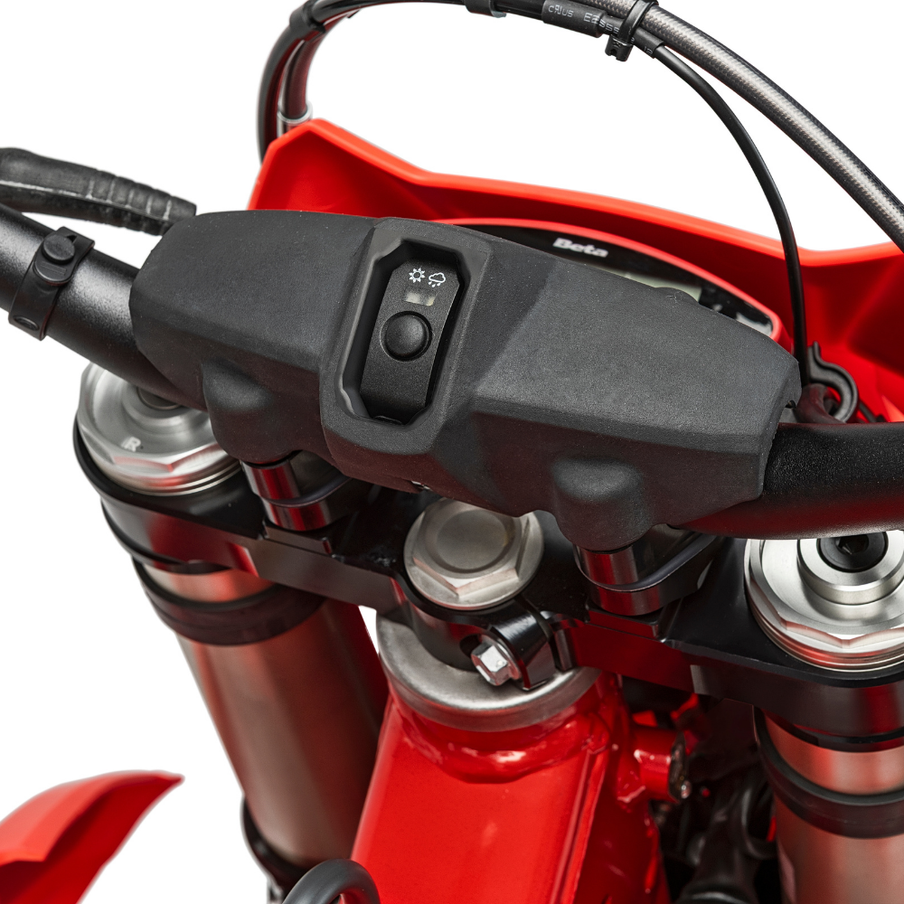 Handlebar Map Switch Retained from last year’s model, the handlebar-mounted map switch remains integrated within the handlebar pad, similar to Beta’s MX lineup. This intuitive placement makes it easy to adjustengine mapping on the fly for optimal performance in changing conditions.